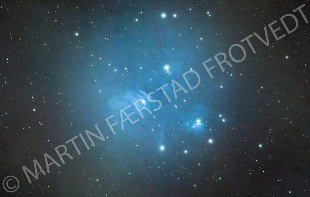 M45 Pleiadene, tatt natt til 04/01/2026. Pleiadene er også kjent som “sjusøstrene”, og er en samling av stjerner. Den befinner seg 440 lysår unna jorden, og kan sees med det blotte øyet på nattehimmelen, selv i middels bynære strøk.