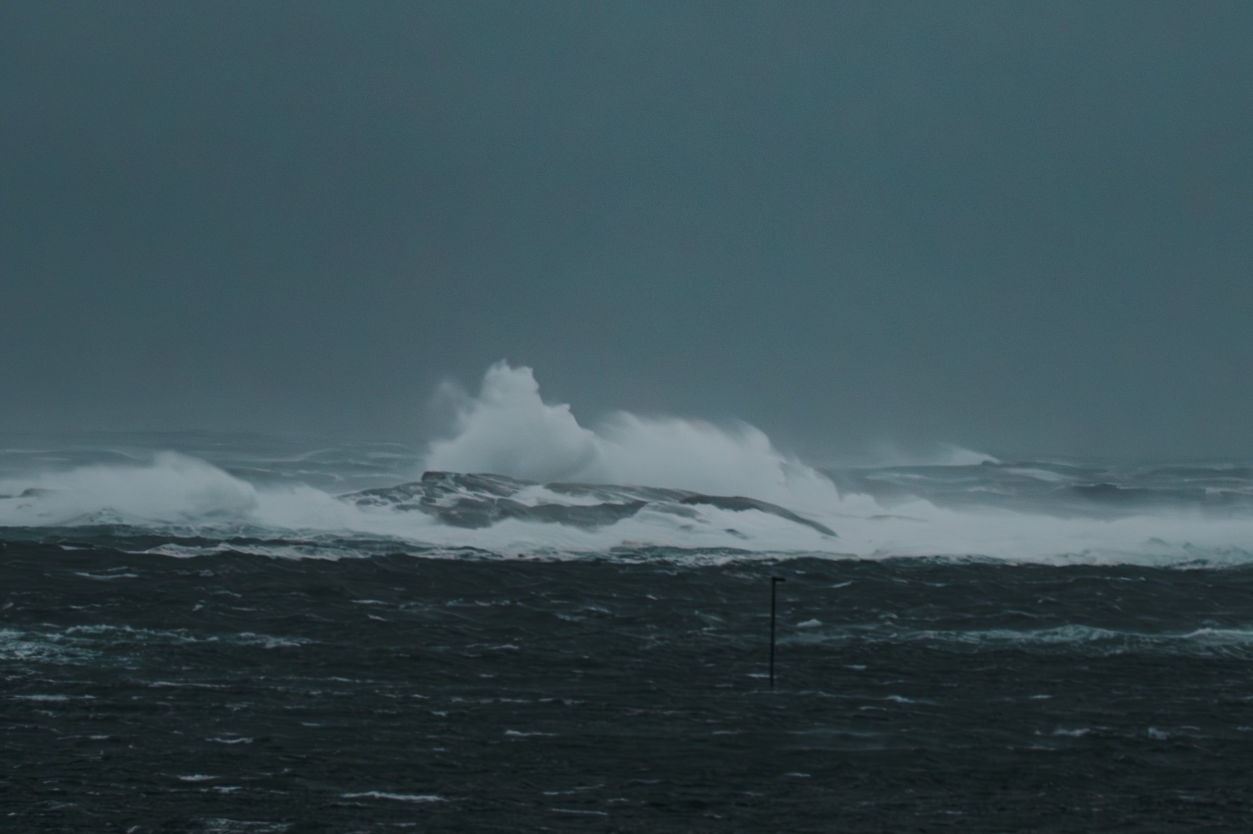Et bilde av bølger som treffer steiner i en storm. Bildet er tatt på vestsiden av Sotra, Bergen